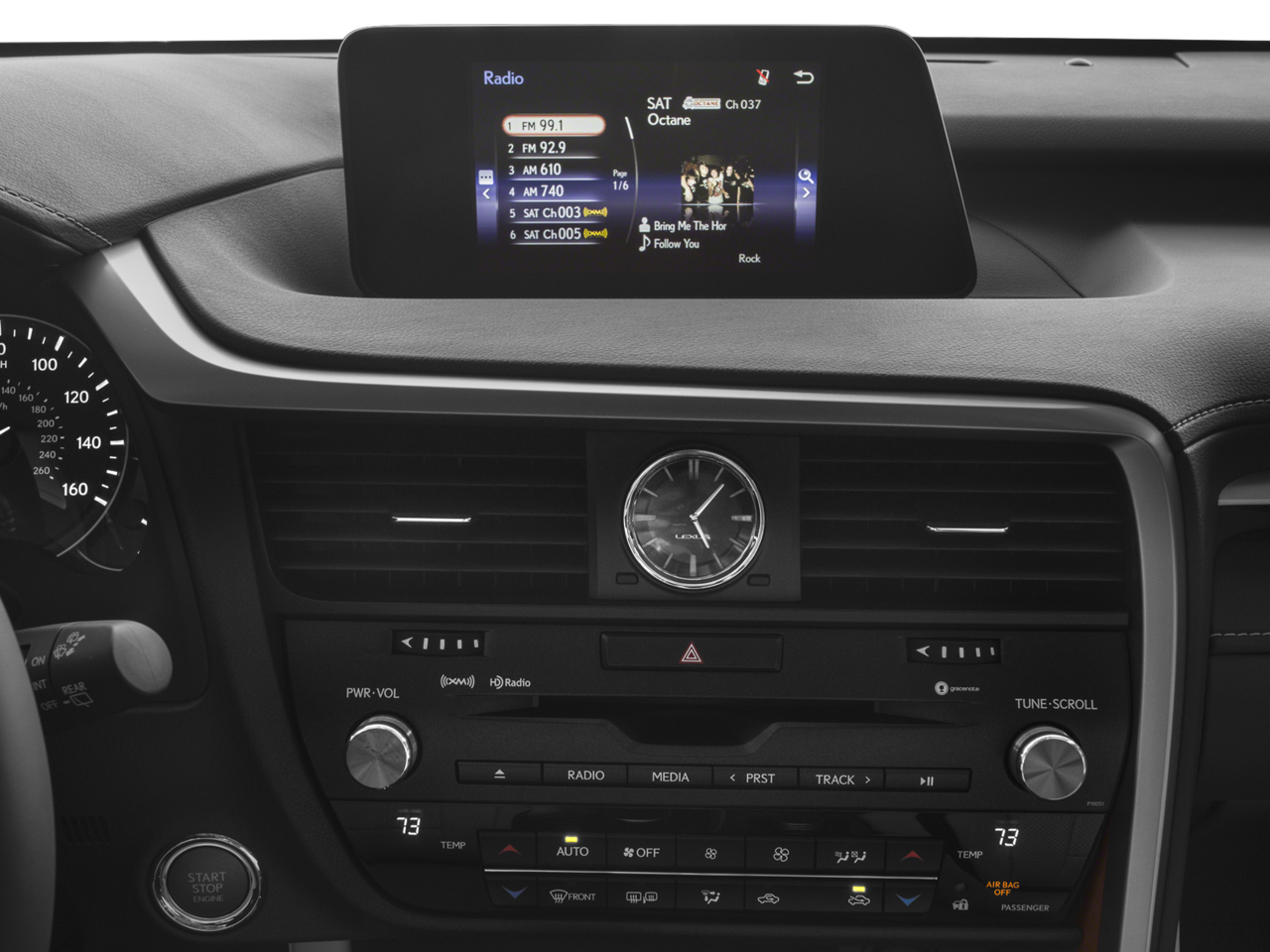 - Radio: AM/FM/CD Lexus Display Audio -inc: 8-inch screen, 9-speaker premium audio system, Bluetooth® hands free phone and automatic phonebook download capabilities, Scout GPS link app-based turn-by-turn directions, voice recognition, Cache Radio, ability to pause/record live AM/FM radio and HD Radio, traffic and weather data provided via HD Radio (free to all users while in HD Radio range), basic traffic map, weather forecast, Siri Eyes Free and Electro Multi Vision (EMV) display